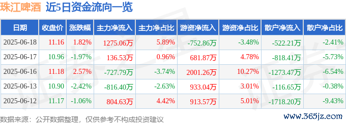 本站消息,截至2025年6月18日收盘,珠江啤酒(002461)报收于11.16元,上涨1.82%,换手率0.86%尚求100,成交量19.08万手,成交额2.17亿元。