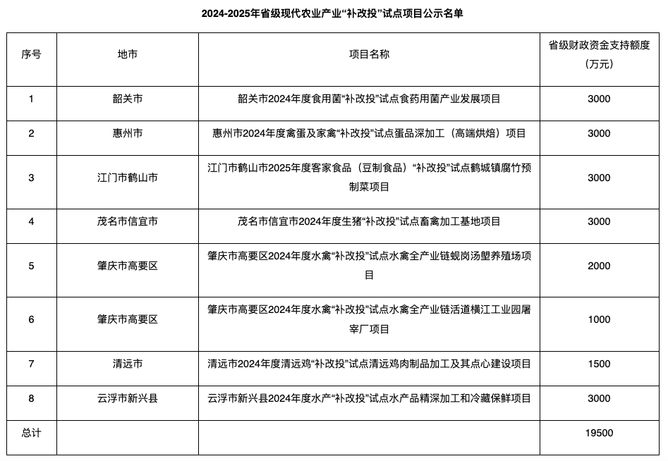 近日八戒策略,广东省农业农村厅公示2024-2025年省级现代农业产业“补改投”试点项目名单。
